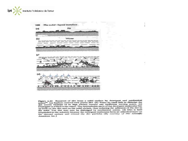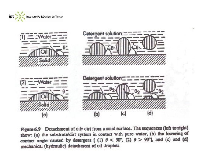 Removal of dirt: Designating by O the dirt (of Oil) we have : WSO = OW + SW - SO The action of the detergent consists to reduce OW and SW decreasing the work of adhesion between the Oil and solid surface. If the dirt is liquid, the removal is a matter of contact angle. The addition of detergent lessens the angle of contact on the SOW interface. If 0 < < 90° removal is by mechanical means, and if 90° < < 180° the process involves solubilization.