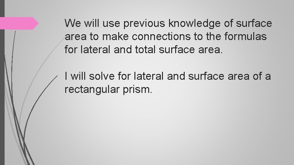 We will use previous knowledge of surface area to make connections to the formulas for lateral and total surface area. I will solve for lateral and surface area of a rectangular prism.