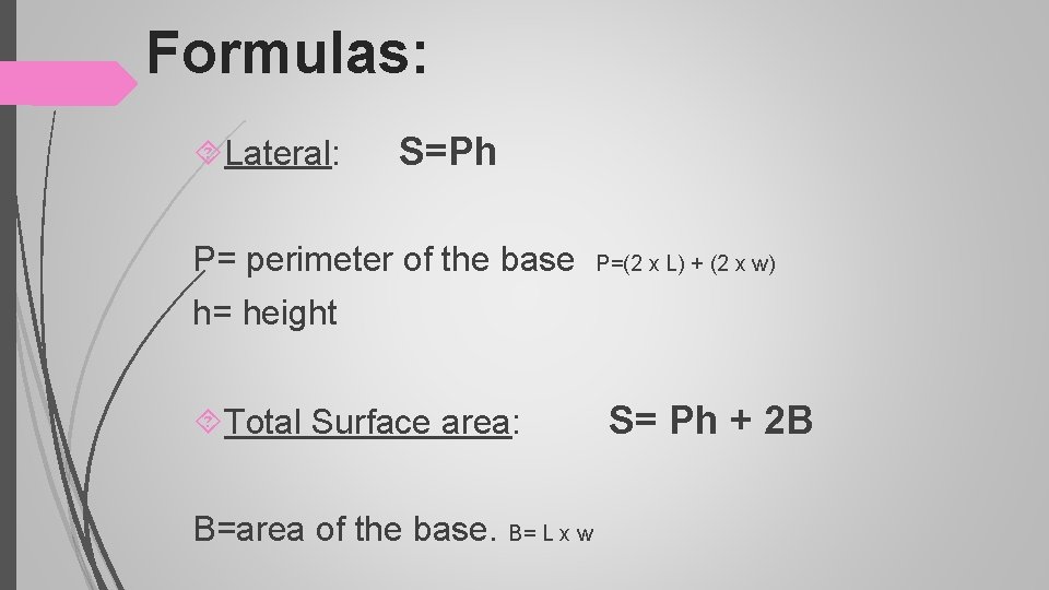 Formulas: Lateral: S=Ph P= perimeter of the base P=(2 x L) + (2 x w) h= height Total Surface area: S= Ph + 2 B B=area of the base. B= L x w