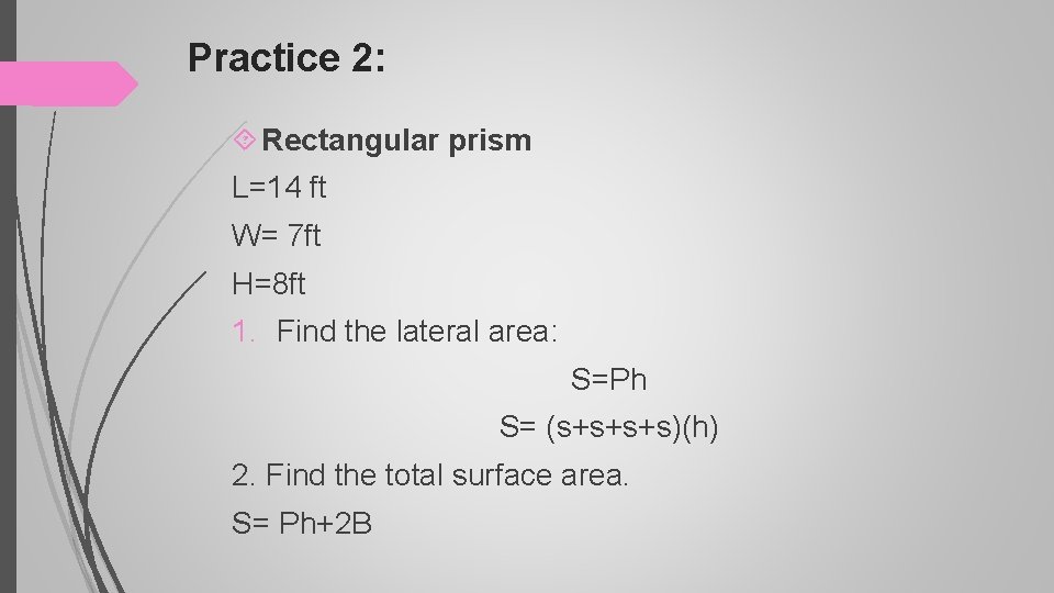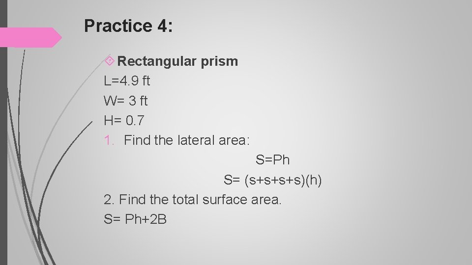 Practice 4: Rectangular prism L=4. 9 ft W= 3 ft H= 0. 7 1. Find the lateral area: S=Ph S= (s+s+s+s)(h) 2. Find the total surface area. S= Ph+2 B