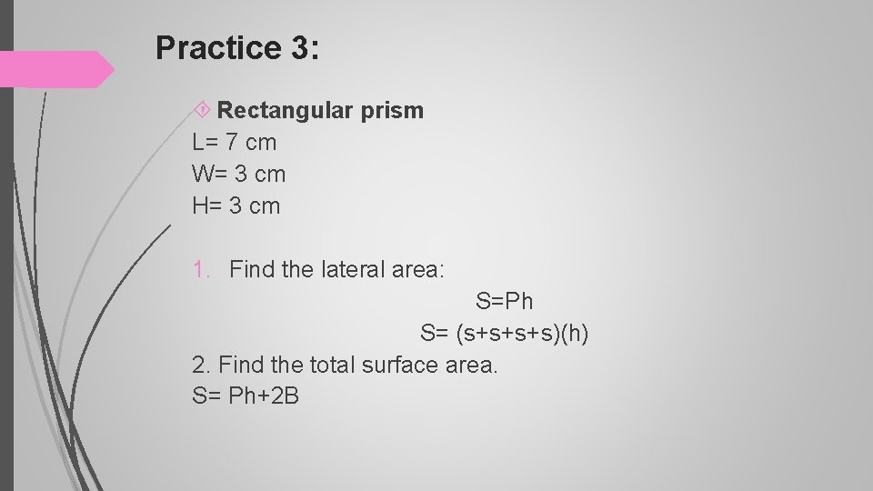 Practice 3: Rectangular prism L= 7 cm W= 3 cm H= 3 cm 1. Find the lateral area: S=Ph S= (s+s+s+s)(h) 2. Find the total surface area. S= Ph+2 B