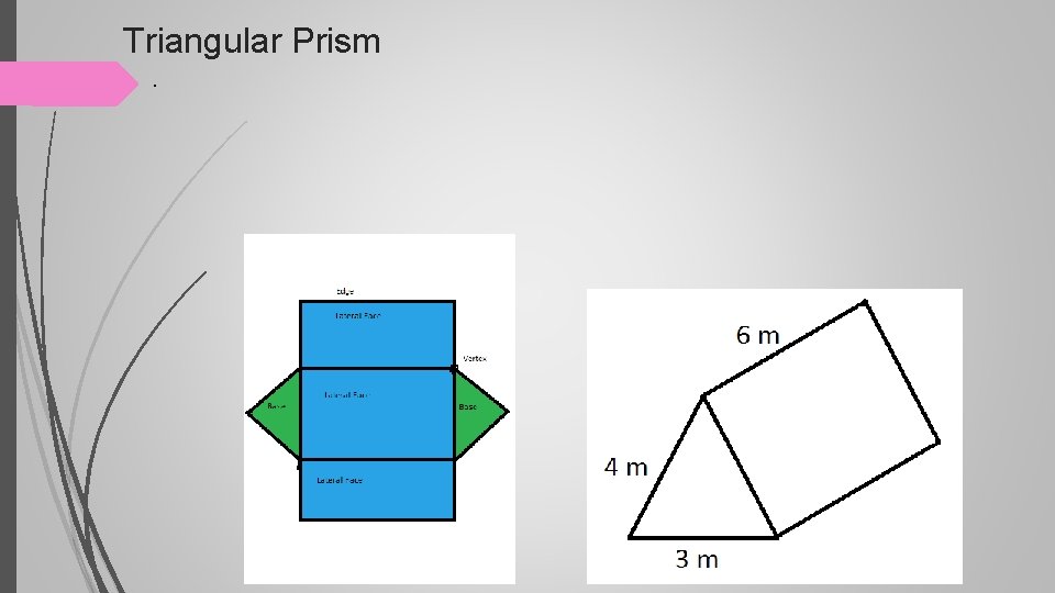 Vocabulary • Base of a triangular prism- the two congruent, opposite and parallel faces shaped like triangles. • Height of the triangular prism- the length of a side that is perpendicular to both bases. Perimeter- the distance around a closed plane figure.