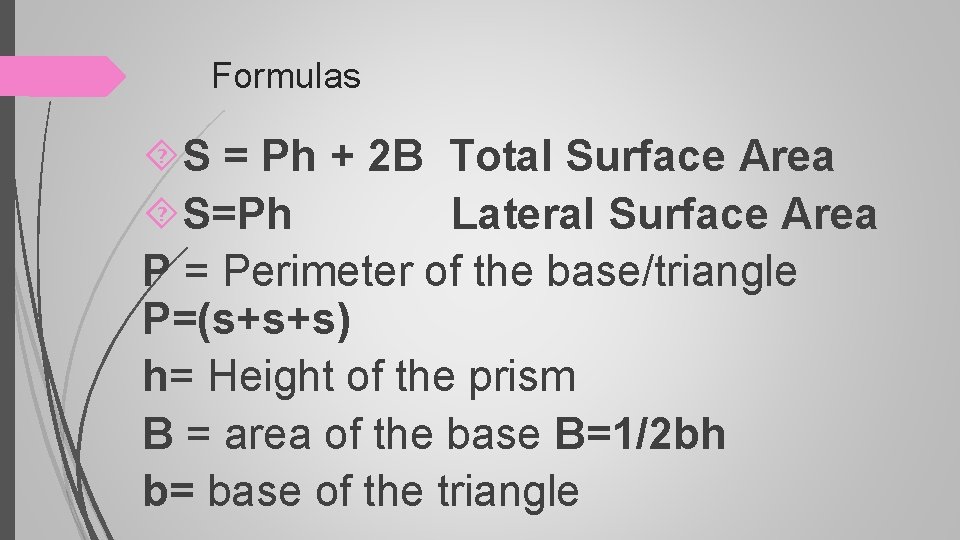 Formulas S = Ph + 2 B Total Surface Area S=Ph Lateral Surface Area P = Perimeter of the base/triangle P=(s+s+s) h= Height of the prism B = area of the base B=1/2 bh b= base of the triangle