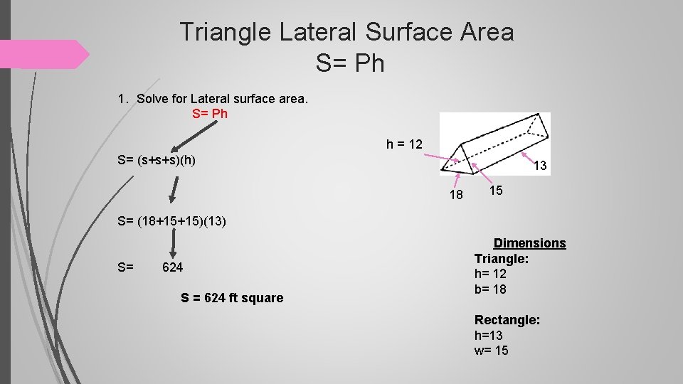 Triangle Lateral Surface Area S= Ph 1. Solve for Lateral surface area. S= Ph h = 12 S= (s+s+s)(h) 13 18 15 S= (18+15+15)(13) S= 624 S = 624 ft square Dimensions Triangle: h= 12 b= 18 Rectangle: h=13 w= 15