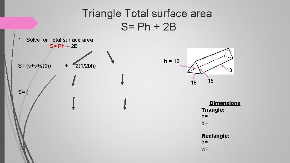Triangle Total surface area S= Ph + 2 B 1. Solve for Total surface area. S= Ph + 2 B S= (s+s+s)(h) + 2(1/2 bh) h = 12 13 18 15 S= ( Dimensions Triangle: h= b= Rectangle: h= w=
