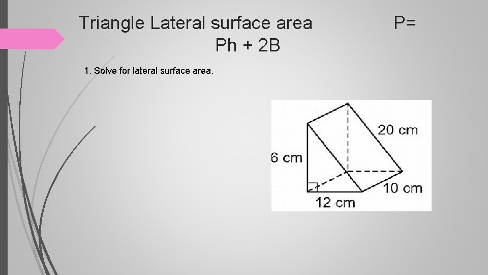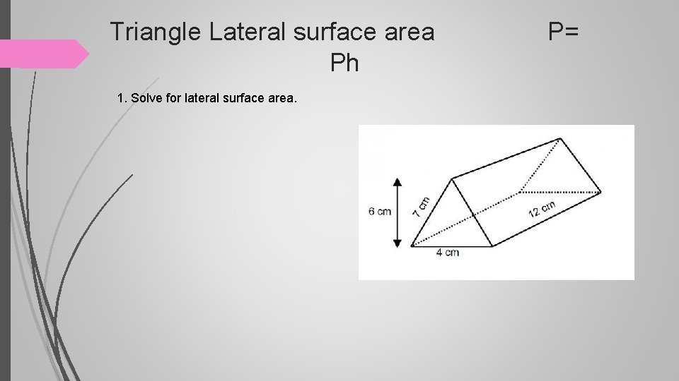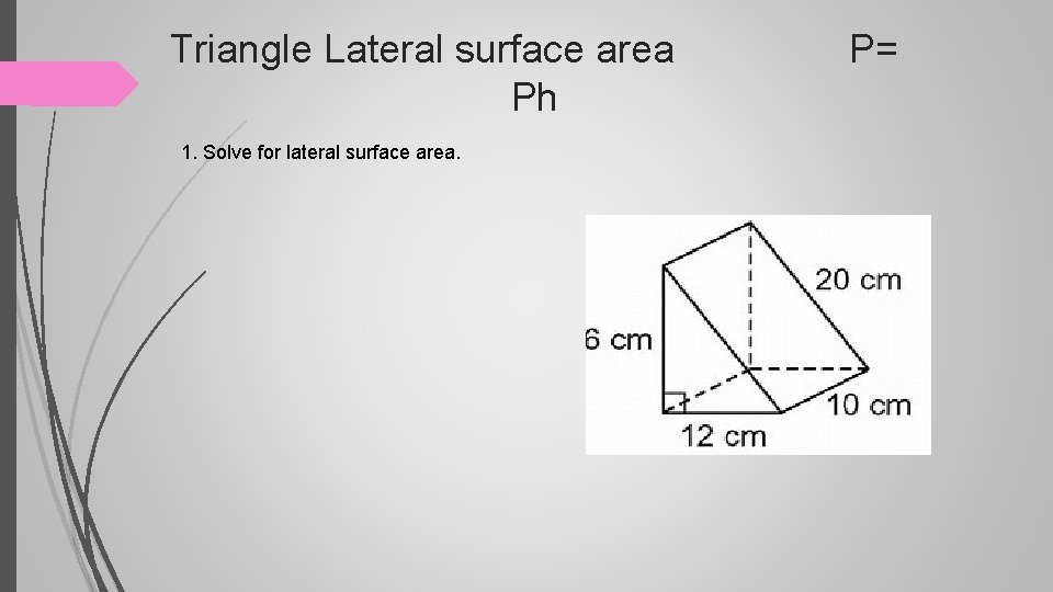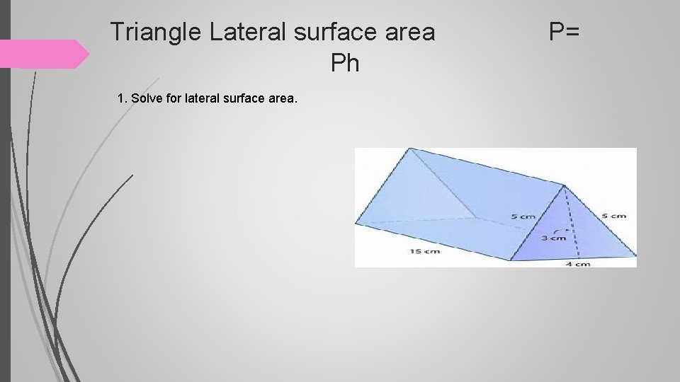Triangle Lateral surface area P= Ph 1. Solve for lateral surface area.