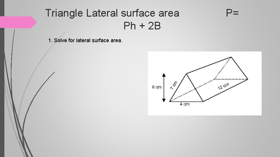Triangle Lateral surface area P= Ph + 2 B 1. Solve for lateral surface area.