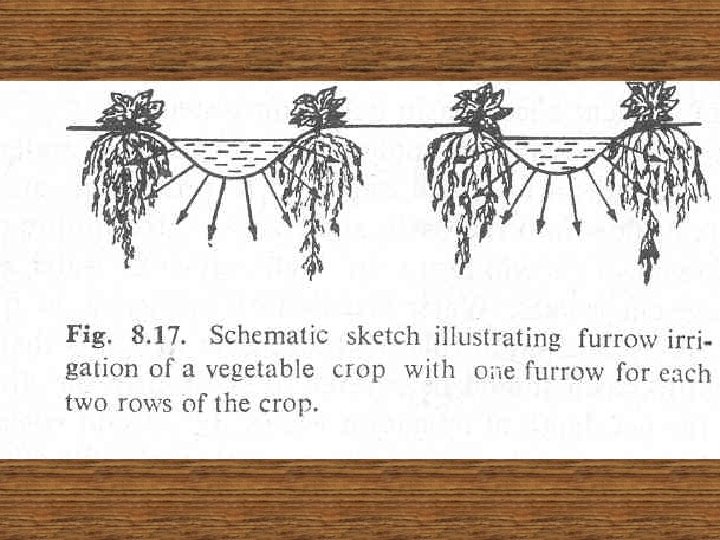 ADVANTAGES OF FURROW METHOD 1. The method is quite suitable for row crops such as maize, cotton, potatoes, sugar cane, sugar beet, groundnut, tobacco, etc. 2. The evaporation losses are smaller because only a part pf the land comes in contact with water. 3. The puddling heavy clayey soil is less in the furrows method. Hence, it is possible to cultivate soon after irrigation. 4. There is no wastage of land for the construction of the field channels required in other methods. 5. The cost of land preparation is less 6. Suitable for water logging sensitive crop like maize