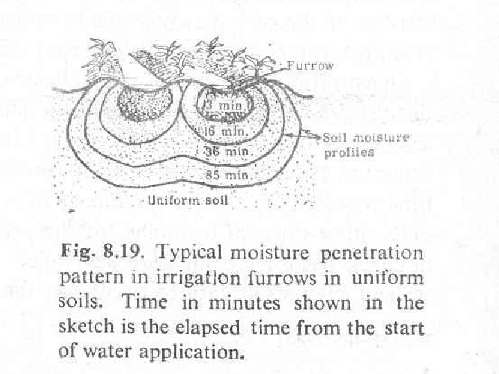 Projecting the border equation derived for the furrow, we get, X= Q / I * T. (1 - e –(I * T * t) / a) Where, X = distance traveled by wetting front, cm Q = discharge, cm 3 / sec I = rate of infiltration, cm / sec T = Top width of furrow, cm t = Time of application of water, sec a = Area of c/s of furrow, cm 2