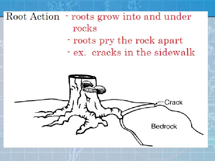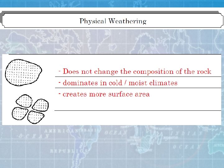 Factors affecting weathering • Climate (VERY IMPORTANT!) • Warm climates favor chemical weathering • Cold climates favor physical weathering (frost action) • The more moisture, the more weathering • Temperate (medium) climates have aspects of both warm and cold climates