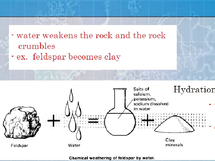 Chemical weathering • Hydration, hydrolysis and solution – reactions of rocks with water White tank campground, Joshua Tree National Park