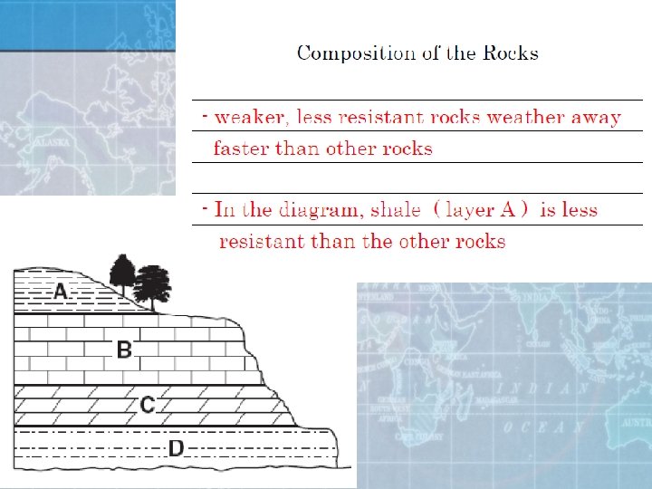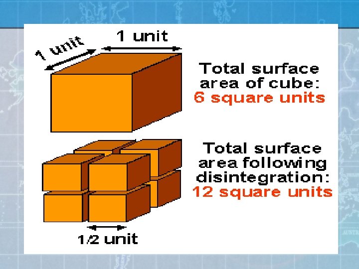 Factors affecting weathering • Particle Size and Surface Area • The smaller the particles of a rock, the faster they will weather • Many smaller particles have more surface area than fewer larger particles
