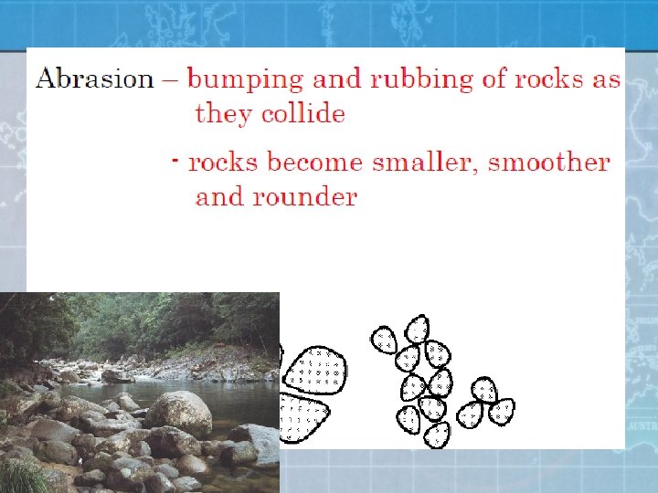 Physical Weathering • Abrasion – rocks rub against each other and get scratched • Often happens in streams • Particles become rounded