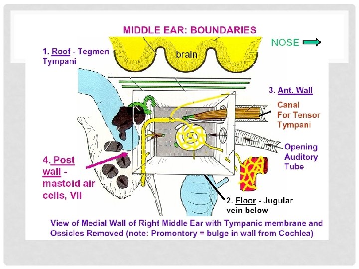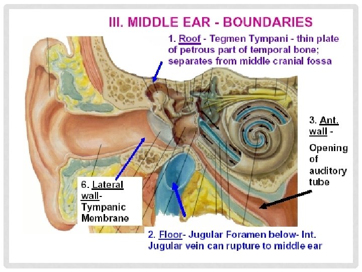 • Tympanic cavity may be thought of as a box with 4 walls, a roof and a floor