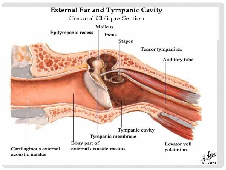 EXTERNAL AUDITORY CANAL • Cartilaginous part • 8 mm • Continous with cartilage of pinna • Fissures of Santorini • Skin contains ceruminous and pilosebaceous glands • Furuncles