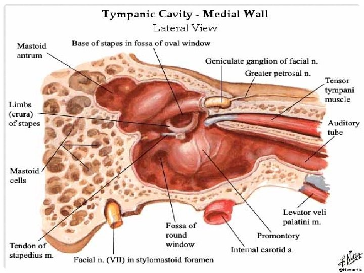 MEDIAL WALL Separates the middle ear from the inner ear • Promontory – basal turn of cochlea • Oval window – opens into vestibule • Round Window – opens into scala tympani • Horizontal tympanic portion of facial nerve • Horizontal semicircular canal – above the facial nerve • Processus cochleariformis – Tendon of tensor tympani takes a turn here