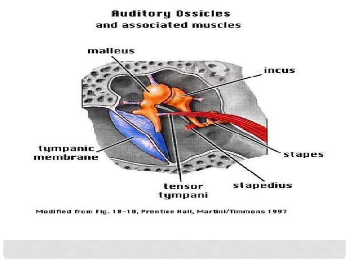 MUSCLES • Tensor tympani 1 st arch muscle Supplied by mandibular nerve Attached to neck of malleus, tenses TM • Stapedius Supplied by facial nerve Attached to neck of stapes. Dampens loud sounds