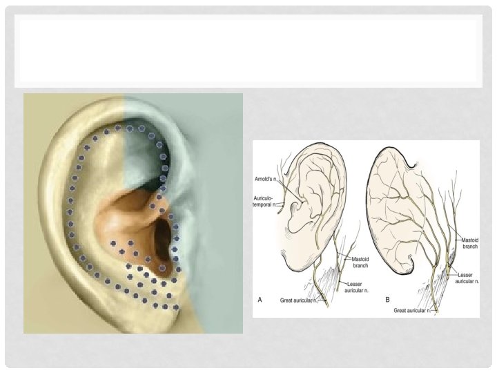 NERVE SUPPLY OF PINNA Nerve Derivation Region supplied Greater Auricular Cervical plexus C 2, 3 Medial surface and posterior portion of lateral surface Lesser Occipital Cervical plexus C 2, 3 Superior portion of medial surface Auricular Vagus X Concha and Antihelix Some supply medial surface (eminetia concha) Auriculotemporal Vc mandibular Tragus, crus of helix and adjacent helix Facial VII Probably supplies small region in the root of concha