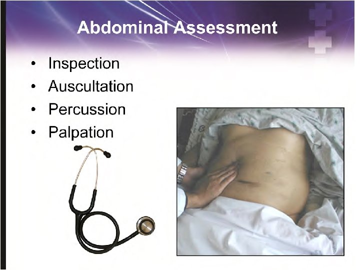 PALPATION 1. Haemodynamic instability. 2. Signs of peritoneal irritation: gaurdining, rigidity tenderness, rebound. 3. Crepitus at lower thoracic cage 4. Pelvic instability 5. Abdominal distension 6. Evisceration 7. Per digital rectal exam.