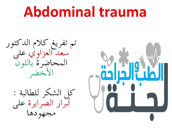 Treatment of liver injury Nonoperative management: is safe, effective, and clearly the treatment modality of choice in hemodynamically stable patients. The weakness in this treatment is the possibility of missing an associated intra abdominal injury Operative management : - simple suture techniques - resectional debridement to control hemorrhage. - Anatomic resection, -hepatic artery ligation - Mesh wrapping or perihepatic packing, -fibrin glue application