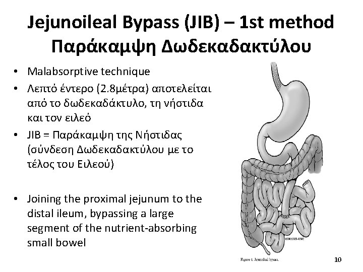 Bariatric Approach • Bariatric (Βάρος + Ιατρική) Operations are – Restrictive (περιοριστικές) (limiting the amount of food ingested) – Malabsorptive (δυσαπορροφητικές) (limiting the amount of nutrient absorbed) • or – Combination • The choice of procedure is guided by: – – – Patients’ BMI Age Comorbidity The cost of the operation Patient’s and Surgeon’s choice 9