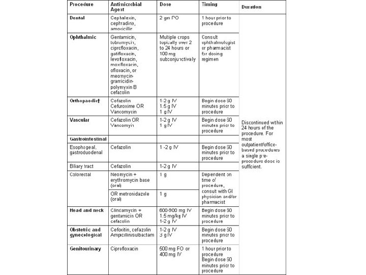 Operative Antibiotic Prophylaxis • Decreases bacterial counts at surgical site • Given within 60 minutes prior to starting surgery (knife to skin) • Repeat dose for longer surgery (T 1/2) • Do not continue beyond 24 hours • Determinants – prevailing pathogens, antibiotic resistance, type of surgery • Not a substitute for aseptic surgery or good technique