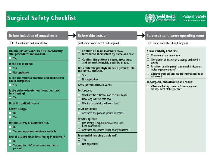 Results – All Sites Baseline Checklist P value Cases 3733 3955 - Death 1. 5% 0. 8% 0. 003 Any Complication 11. 0% 7. 0% <0. 001 SSI 6. 2% 3. 4% <0. 001 Unplanned Reoperation 2. 4% 1. 8% 0. 047 Haynes et al. A Surgical Safety Checklist to Reduce Morbidity and Mortality in a Global Population. New England Journal of Medicine 360: 491 -9. (2009)