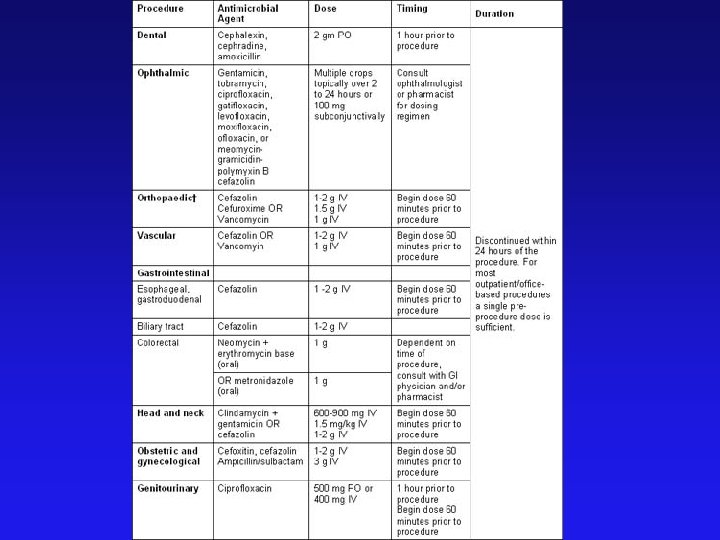 Principles of Antibiotic Prophylaxis Preop administration, serum levels adequate throughout procedure with a drug active against expected microorganisms. High Serum Levels 1. Preop timing 2. IV route 3. Highest dose of drug During Procedure 1. Long half-life 2. Long procedure– redose 3. Large blood loss– redose Duration 1. None after wound closed 2. 24 hours maximum Mangram AJ et al. Infect Control Hosp Epidemiol. 1999; 20: 250 -278.