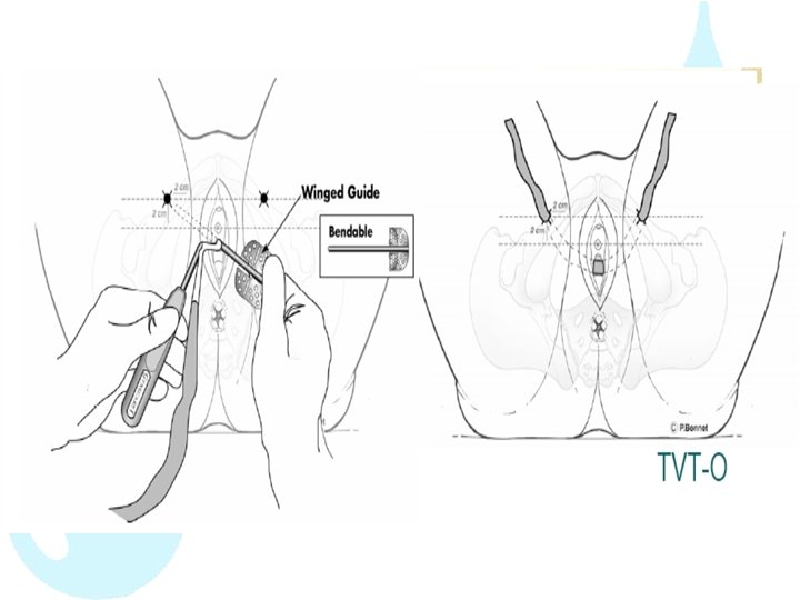 Transobturator Tape (TOT) • Delorme 1 in transobturator procedure 2001 described the (outside-in : TOT) • Insert mesh tape under the urethra through small incisions in the groin area • eliminates retropubic needle passage
