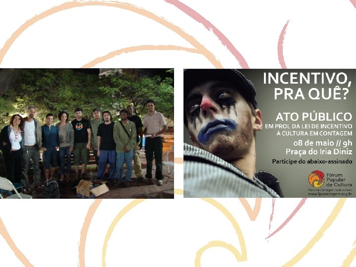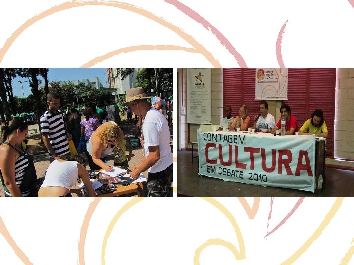 Algumas atividades realizadas • Reuniões com artistas, gestores, produtores, ativistas culturais. • Organização de “Atos Públicos”. • Realização de abaixo-assinados. • Debates e discussões com convidados. • Criação de espaços como Contagem Cultura em Debate e ciclos de palestras • Articulação para criação da frente parlamentar de cultura