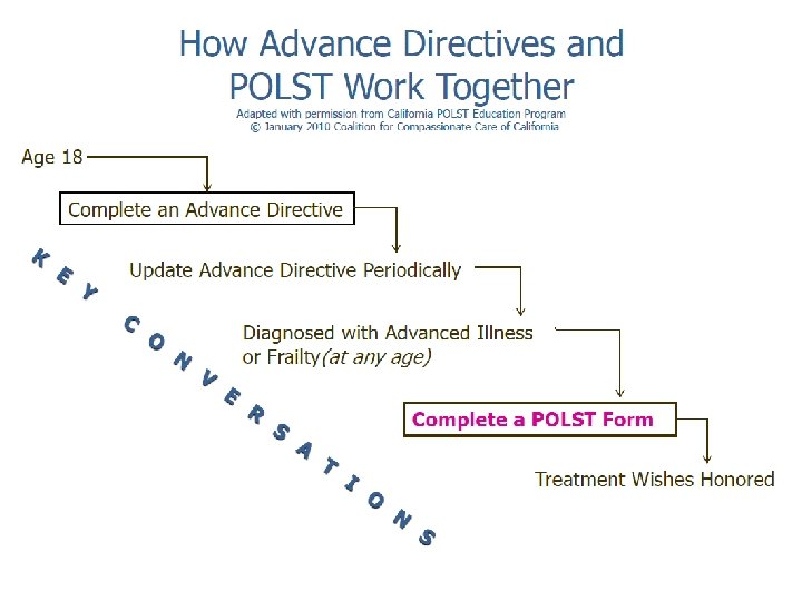 POLST = Physician Orders for Life-Sustaining Treatment Ø Primary target group: Patients for whom death in a year would not be a surprise. Ø Goal: To convert patient’s goals of care into a portable set of medical orders addressing key decisions. Ø Requires: 1. Find out patient’s wishes re: CPR, care goals (comfort vs. treatment), antibiotics, N&H. 2. Translate into doctors orders on visually distinct (bright pink) standard form. 3. Ensure form travels with patient.