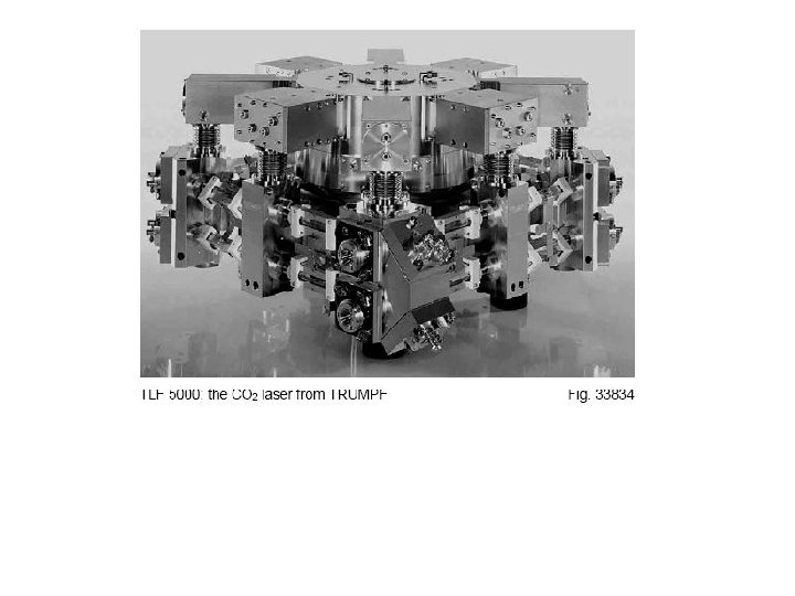Laserul cu CO 2 utilizează un amestec de gaze ce conţine 60 -85% He, 13 -55 N 2 şi 1 -9% CO 2 şi este utilizat pentru tăire, sudare şi în ingineria suprafeţelor. Puterea laserului cu CO 2 poate ajunge până la 50 k. W, dar frecvent sunt utilizaţi laseri cu puterea cuprinsă între 3 -12 k. W în industria construcţiilor de autovehicule, la sudarea caroseriilor sau pentru tăierea termică. Puterea laserului cu CO 2 este dată de lungimea tubului de descărcare, respectiv a rezonatorului. O lungime a tubului de descărcare de 1 m poate furniza o putere de cca. 1 k. W. Ca să atingă puteri de zeci de k. W, laserii cu CO 2 trebuie să desfăşoare o lungime totală a tuburilor de descărcare de zeci de metri. Pentru a realiza o construcţie compactă a laserului, tuburile de descărcare sunt dispuse după direcţii ortogonale pe mai multe nivele, trecerea de la un nivel la altul sau schimbarea direcţiei razei laser efectuându-se cu ajutorul unor sisteme optice rigide. În timpul procesului de formare a radiaţiei laser, gazul trebuie circulat şi reîmprospătat, respectiv este necesară răcirea continuă a lui pe toată durata de funcţionare a instalaţiei Schema de principiu a unui laser cu CO 2 (λ = 10. 6 μm) În primă fază sunt excitaţi atomii de gaz N 2 care prin coliziune transferă energia lor moleculelor de gaz CO 2 şi pe urmă revin la starea energetică iniţială. Emisia spontană a atomilor de CO 2 eliberează fotoni cu lungimea de undă de 10. 6 μm, diferenţa de energie după tranziţia electronului şi eliberarea fotonului până la starea energetică normală este eliberată sub formă de căldură. În acest punct intervine rolul heliului care un foarte bun coeficient de transfer termic şi asigură preluarea şi disiparea căldurii în sistemul de răcire a instalaţiei.