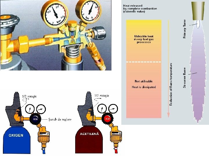 Zona I – nucleul luminos a flăcării corespunde disocierii acetilenei şi începutul arderii carbonului. Nucleul are forma unei jumătăţi de elipsoid de rotaţie şi este delimitat la exterior de un strat de carbon liber incandescent care produce o luminozitate mărită. Zona II – are o formă conică ce înfăşoară nucleul flăcării (zona I) şi se caracterizează printr-o transparenţă mărită. În această zonă se produce arderea primară cu formarea monoxidului de carbon şi degajarea unei importante cantităţi de căldură, gazele rezultate având caracter chimic reducător. Temperatura maximă apare la cca. 5 – 20 mm de extremitatea nucleului, în funcţie de debitul gazelor şi variază între 3100 -3160 ºC în funcţie de puritatea gazelor. Cu toate acestea, randamentul tehnic al flăcării este foarte redus (η= 0, 11 – 0, 80) datorită dispersiei pronunţate a căldurii flăcării. Zona III – este zona cea mai dezvoltată a flăcării având un caracter chimic oxidant şi turbulent datorită pătrunderii unui volum important de aer în flacără antrenat de straturile superficiale de gaze ejectate cu viteză din arzător. În zona III se produce arderea completă a gazelor CO şi H 2 produşii de reacţie fiind CO 2 şi H 2 O sub formă de vapori, ceea ce va conferi flăcării de sudare din această zonă o luminozitate mai mare. Temperatura flăcării este mai scăzută decât a zonei de ardere primare datorită schimbului termic mai intens cu mediul înconjurător şi datorită dezvoltării mari a flăcării ceea ce reduce din concentrarea câmpului termic.