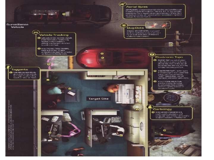 Surveillance Types: 4. Undercover: • Dangerous! • Spy in enemy camp • Narcs at music concerts 5. Bugging or intercepting communications 6. Video 7. Satellite-GPS • High speed pursuit-Cop car shoots GPS tag on car