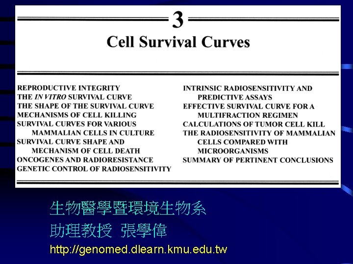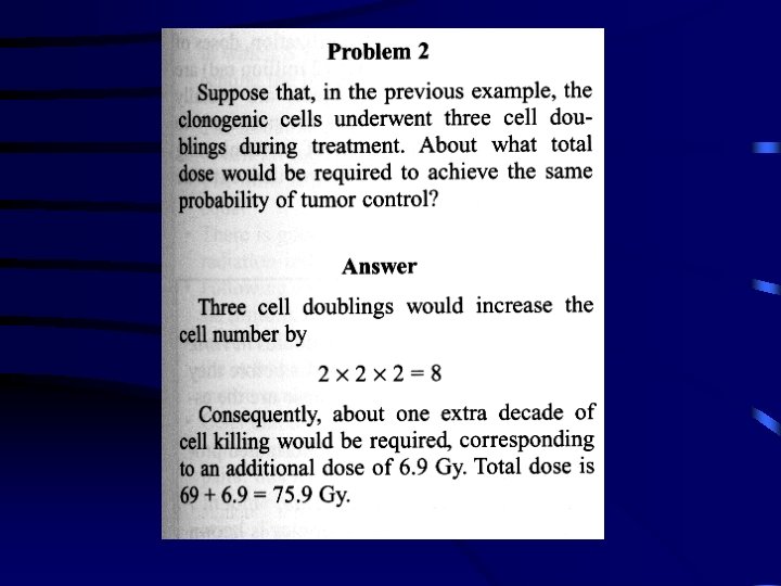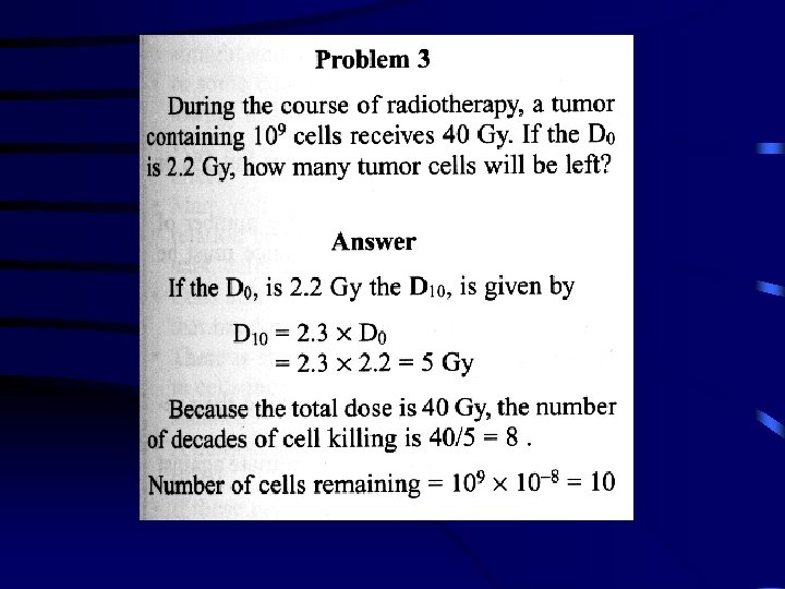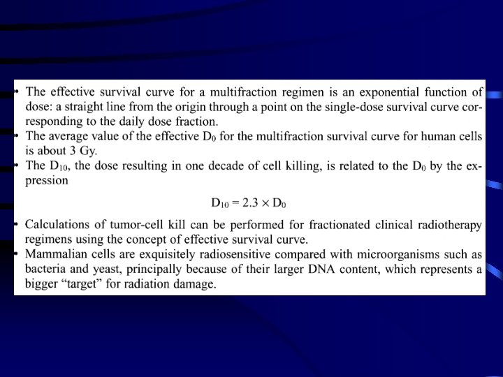 For human, effective D 0 (37% survival) = 300 c. Gy = 3 Gy D 10 (the dose required to kill 90% = 10 % survival) = one decade of cell killing = 2. 3 X D 0 • Natural log 10 = 2. 3 • equal Slope Ps: equal Slope Logen = Dq/D 0 (F 3. 3 & page 37)