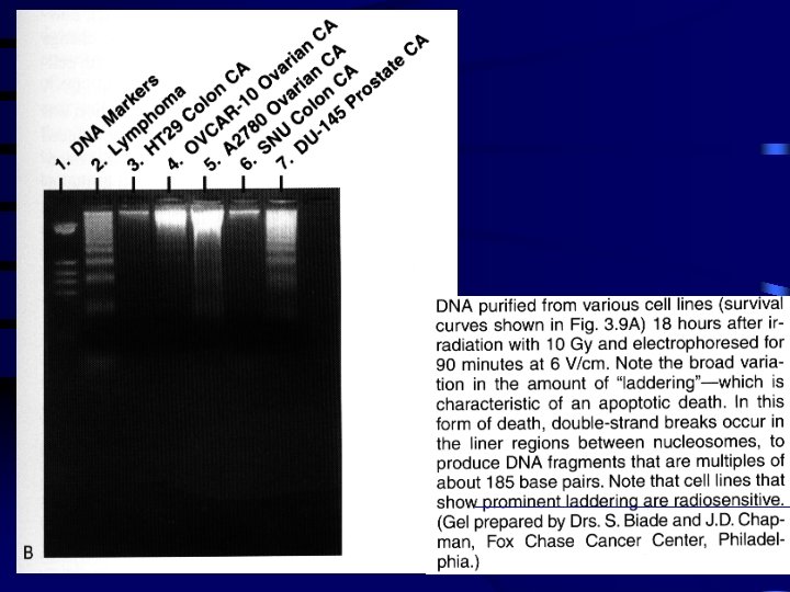 The detection of this DNA ladder is still currently used to distinguish at the molecular level apoptosis from necrosis. • Apoptosis: Dsb in linker DNA between nucleosome 185 bp [“ladder” in Gel] • nercosis [“smear” in Gel] Fig. 3 -9