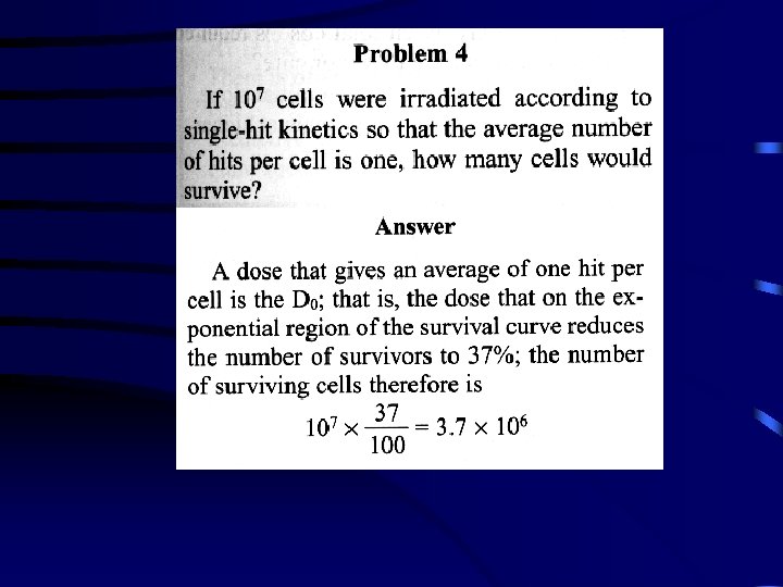 D 1 & D 0 = the dose required to reduce the fraction of surviving cells to 37% of it previous value. D 0 (straight at high dose) = the average dose required to deliver one inactivating event (one hit) per cell. = the dose required to reduce survival from 0. 1 to 0. 037 or 0. 01 to 0. 0037. = D 0 (37% survival) dose required to reduce survival to e-1 (0. 37)