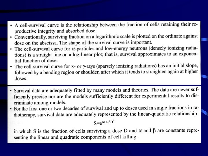 Linear –quadratic model Two components to cell killing by radiation One that is proportional to dose One that is proportional to square of dose (dual-radiation action; two separate breaks) S = e-a. D-b. D 2