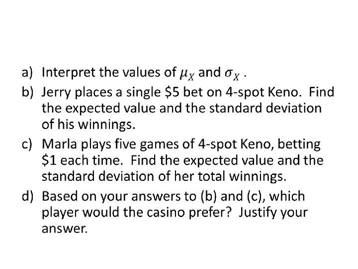 Keno • Matches Probability Payout 0 1 2 3 4 0. 308 0. 433 0. 213 0. 043 0. 003 $0 $0 $1 $3 $120