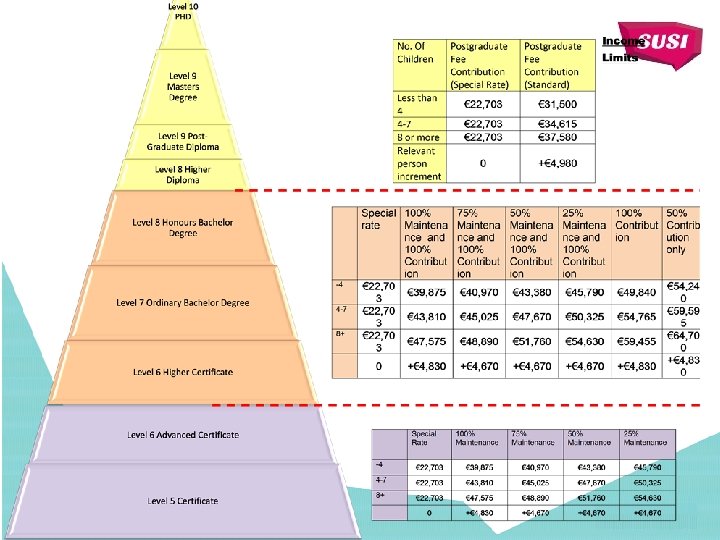 Grant Types and Rates (Dependent on your Household Income) • Fee Grant: Ø € 3, 000 Student Contribution; Ø € 2, 000, or up to € 6, 270, Postgraduate Fees; Ø 50% or 100% rates; and Ø Paid directly to Colleges. • Maintenance Grant (“adjacent”<45 k from college): Ø Ø Ø € 1, 215 adjacent/ € 3, 025 non-adjacent; 25%, 50%, 75%, 100% rates; Special rate: € 2, 375 adjacent/ € 5, 915 non-adjacent; Paid to Students (9 monthly instalments); and Generally not payable if on BTEA.