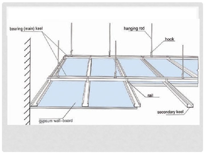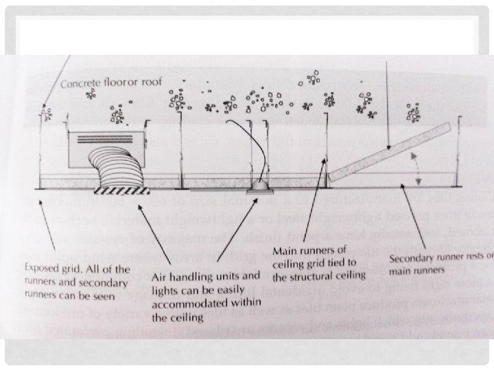 SUSPENDED CEILING • SUSPENDED CEILINGS are used to provide an attractive finish to the ceiling and at the same time conceal services. • These are used to house equipment like ventilation grills, light fittings, fire sprinklers, smoke or heat detectors, security cameras, movement sensors and alarms.