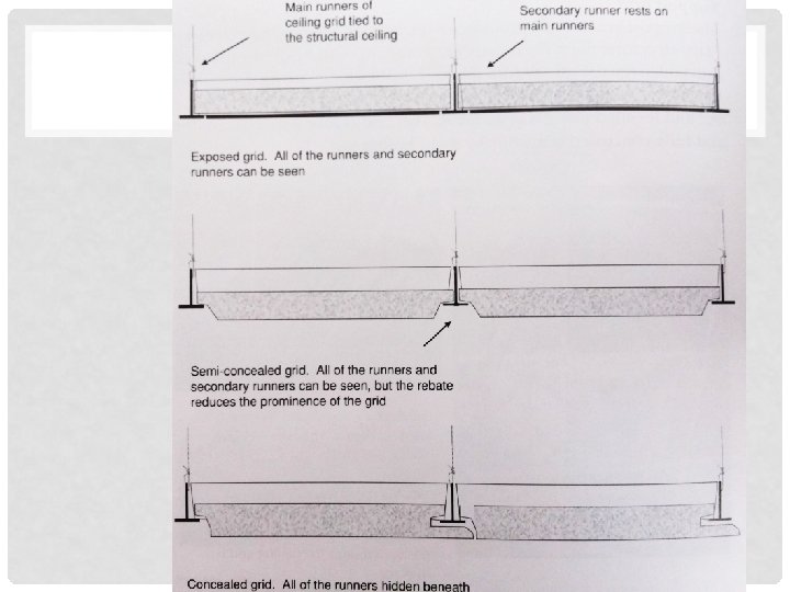 • Suspended ceilings have: • Light weight structural grid • Wire hangers to support the grids from the structural floor. • Lightweight tiles • Suspended ceilings are based normally on a 600 x 600 mm module.