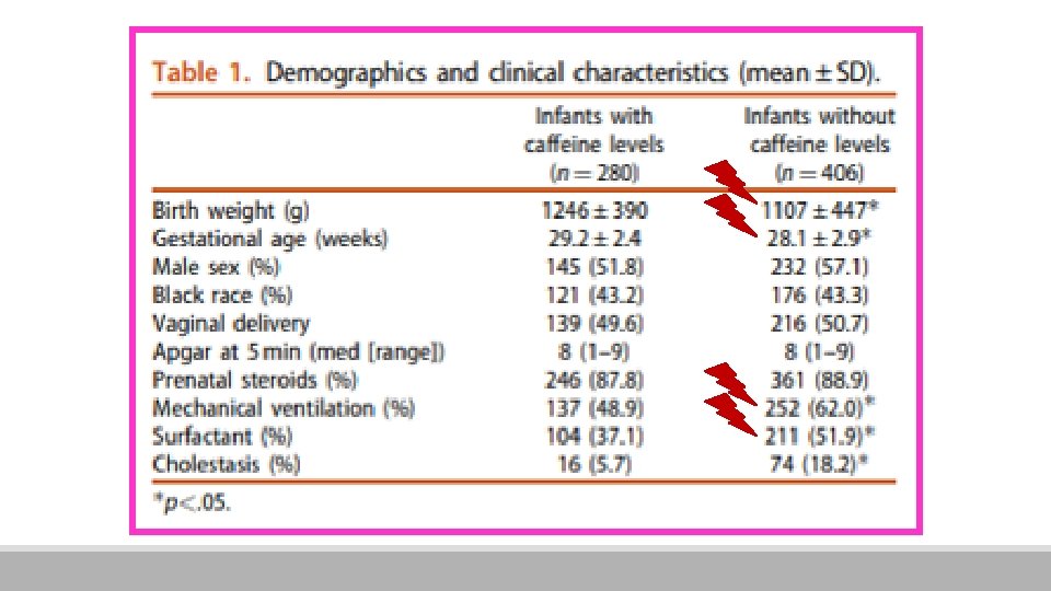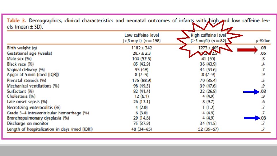§Os níveis de cafeína medidos 5 dias após a descontinuação da cafeína foram ≥ a 5 mg/L em 82 de 280 crianças (29, 3%) §Na Tabela 3, características clínicas e demográficas e resultados neonatos das crianças com alto (>5 m/L) e baixo nível de cafeína )média ± desvio padrão e ≥ 5 mg/L. § O peso ao nascer e a idade gestacional foram menores em lactentes com baixos níveis de cafeína, mas não atingiram o nível de significância. § O número de crianças que recebeu surfactante ou desenvolveu broncopulmonar displasia (DBP) foi menor no grupo de alto nível de cafeína § Mais crianças no grupo de alto nível de cafeína estavam recebendo> 5 mg / kg / dia de cafeína quando a medicação foi interrompida.