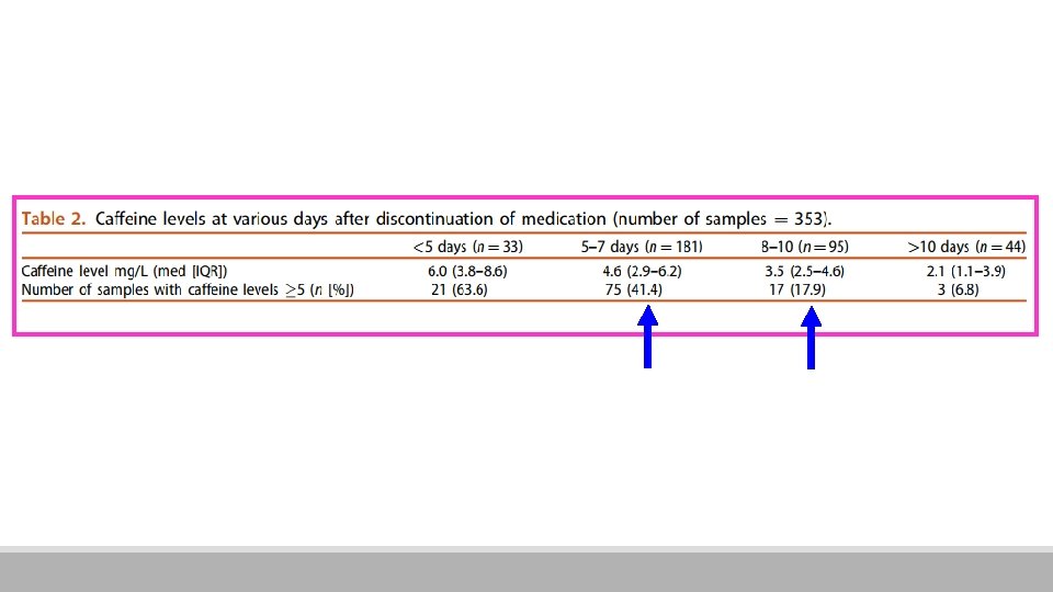 Resultados § Dia mediano para medir nível de cafeína após a interrupção: 7 (1 -32) § Nível de cafeína: 3, 9 mg/L (< 1 -27, 8 mg/L) §Na Tabela 1, as características demográficas e clínicas da população estudada: menores peso e idades gestacionais no grupo sem níveis de cafeína, assim como maior tempo de ventilação, uso de surfactante e colestase § Níveis de cafeína foram medidos na IGPM média de 35, 5 ± 1, 4 semanas § Mais de 41% dos níveis de cafeína medidos entre 5 -7 dias foram ≥ a 5 mg/L e aproximadamente 18% entre 8 -10 dias foram níveis terapêuticos (Tabela 2)