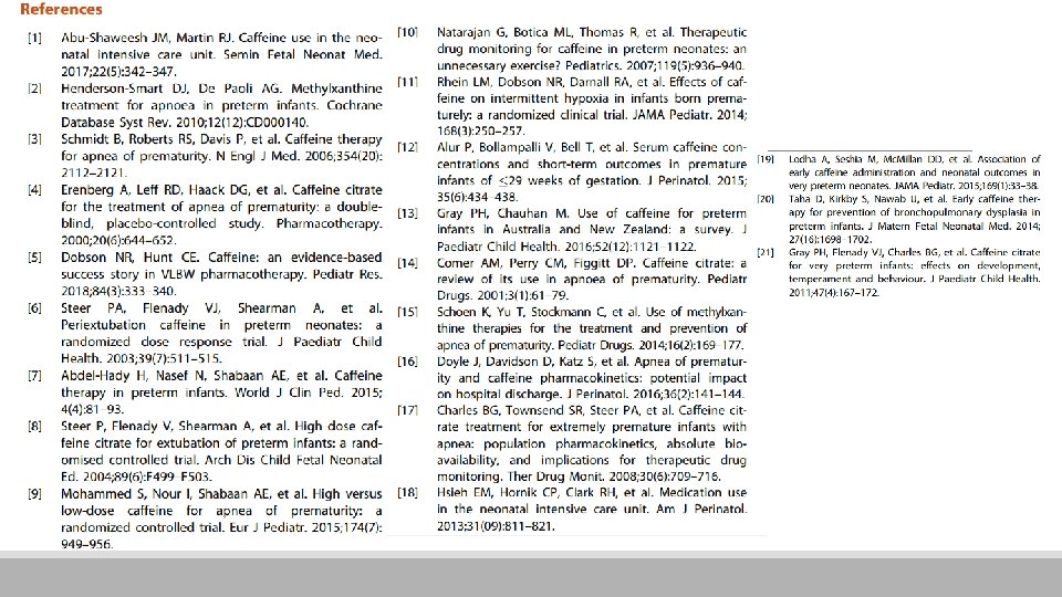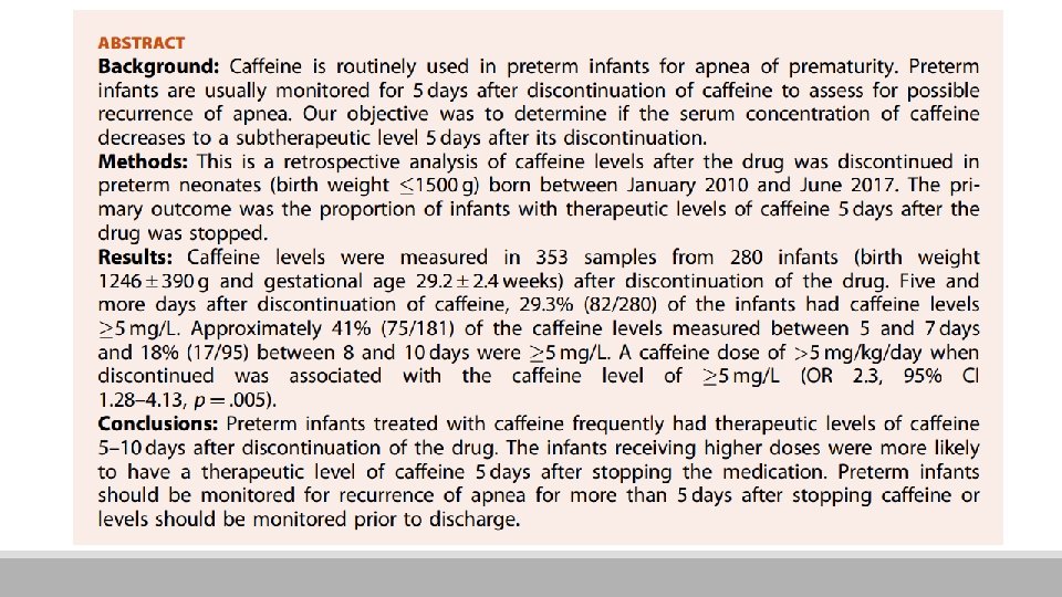 Introdução § Período de monitoramento de recorrência de apneia é uma das considerações para alta hospitalar segura § Geralmente este período é de 5 -7 dias após a suspensão da cafeína § Concentração sérica de cafeína é mantida de 5 -20 mg/L em prematuros § Uso de dose mais alta correlacionado com eficácia aprimorada em prevenir episódios de apneia nível pode ser potencialmente terapêutico após 5 -7 dias da interrupção