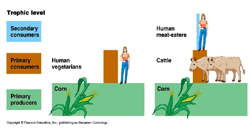 As you move along a food chain, energy is lost between each trophic level and the next. 90% energy lost Cereal plant Farm animal 10% energy passed on 90% energy lost Human 10% energy passed on As a result of this loss of energy, livestock production generates far less food per area of land than plant production.