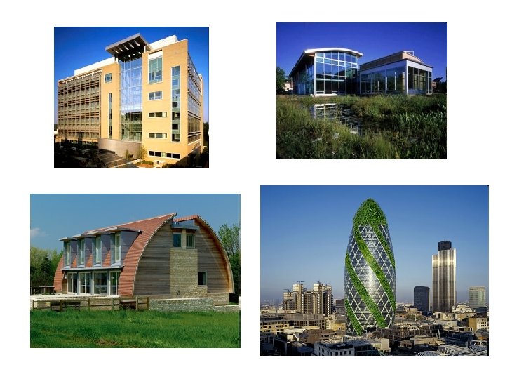 Sustainable architecture : Green buildings What are they ? ENERGY ENVIRONMENT Minimize impact on environment Use renewable energy Prevent loss of energy Good use of the existing environment Use less energy Avoid depletion* of resources Use recycled and sustainable materials RESOURCES *épuisement
