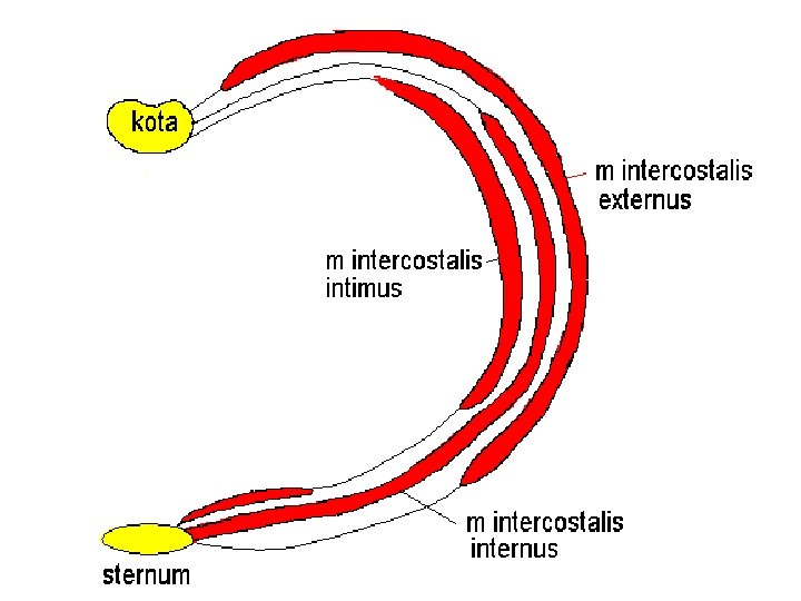 Vlastní svaly hrudníku • mm. intercostales externi – od tuberculum costae po žeberní chrupavku – dále membrana intercostalis externa až k hrudní kosti vdech • mm. intercostales interni – od hrudní kosti k angulus costae – dále membrana intercostalis interna až k páteři • mm. intercostales intimi – jako interni, slabší – úpon navnitř od sulcus costae výdech