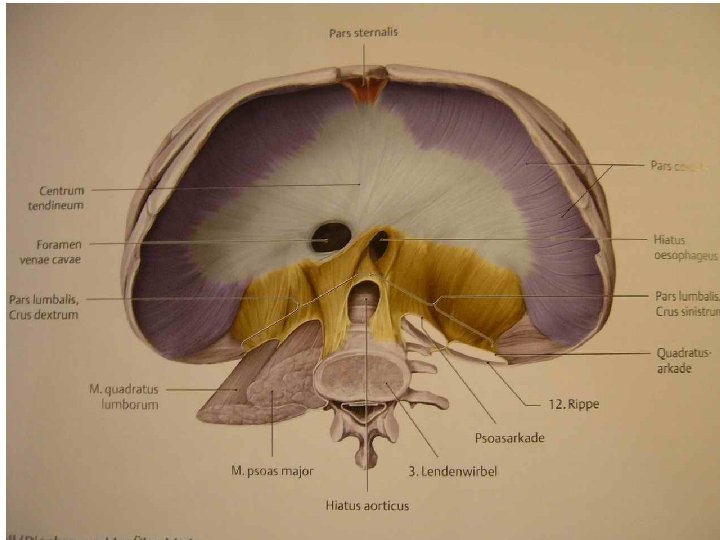 Bránice (Diaphragma, ř. Phren) • • • savci, krokodýli 3 -5 mm silná svalově-šlachová blána oddělující hrudní a břišní dutinu hlavní vdechový sval - odvádí 60– 80 % práce pomáhá stabilizovat hrudně-bederní přechod páteře