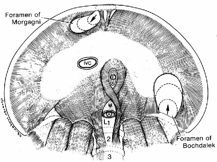 Bránice • pravá a levá brániční klenba (4. a 5. mezižebří) • centrum tendineum • pars lumbalis – crus dextrum et sinistrum • pars costalis • pars sternalis • trigonum lumbocostale Bochdaleki • trigonum sternocostale Morgagni s. Larreyi • hlavní vdechový sval • aktivní i při výdechu